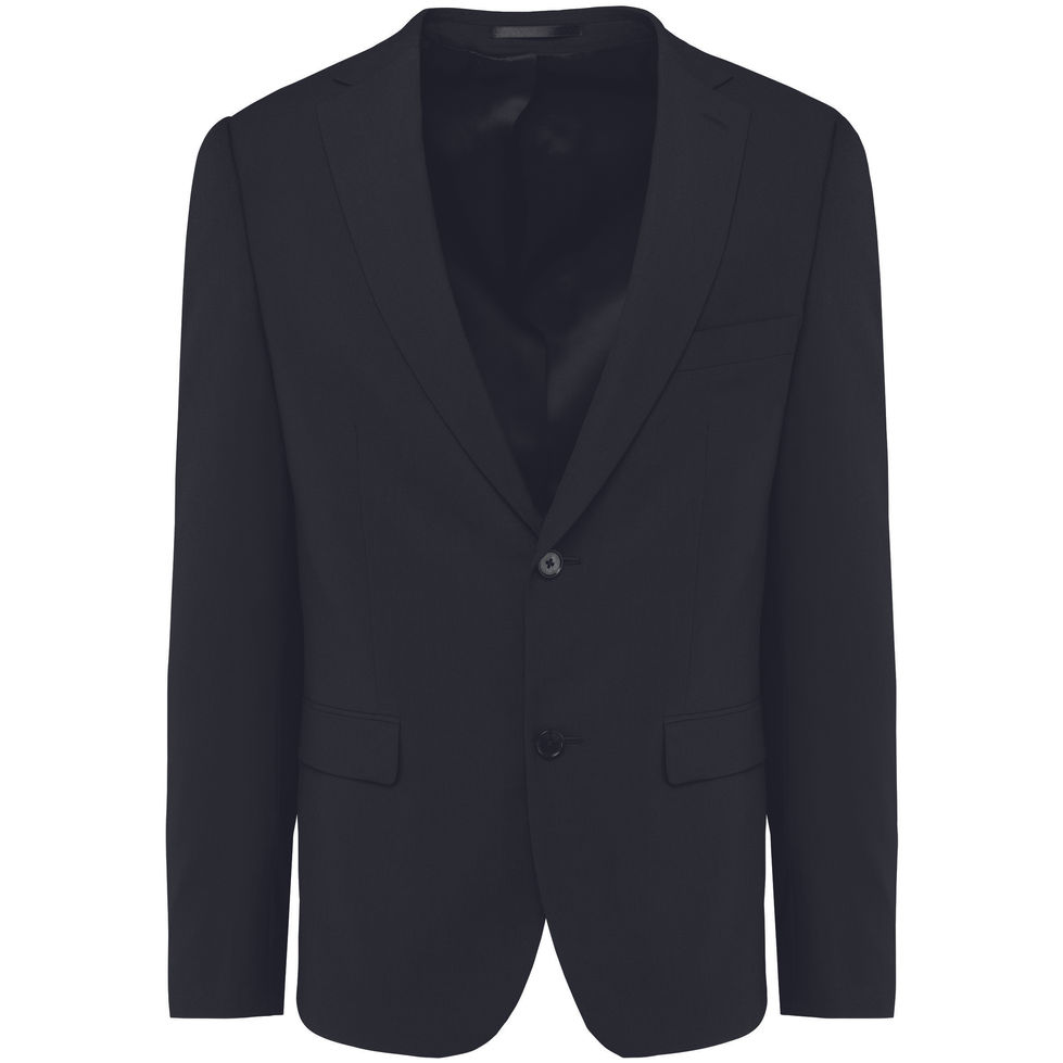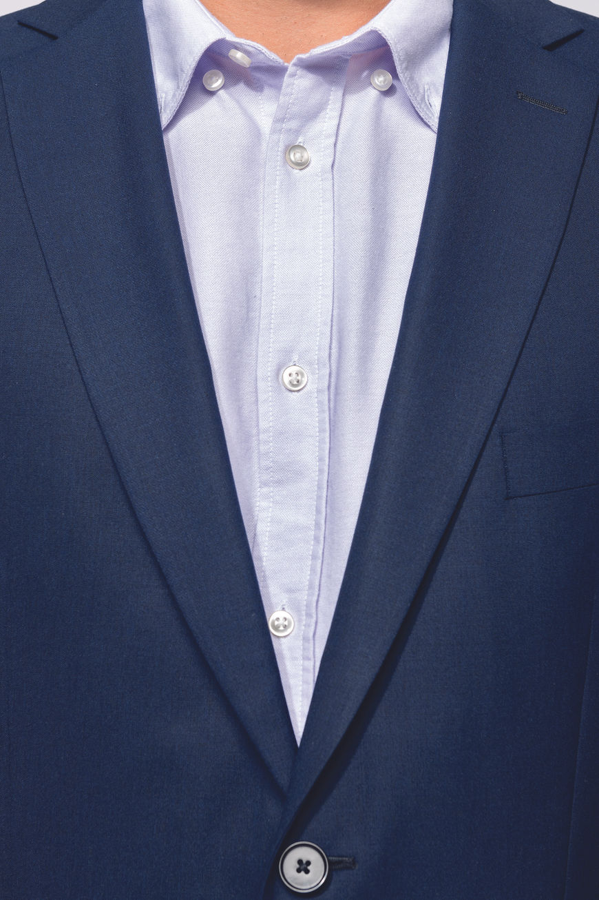 50% polyester / 23% viscose / 22% laine / 5% élasthanne. Doublure en twill (100% polyester) ton sur ton ton. Coupe ajustée. Veste à deux boutons ton sur ton. Deux poches passepoilées avec rabats, ainsi qu'une poche poitrine passepoilée côté cœur. Fausse boutonnière ton sur ton sur revers de col. Empiècement côté qui vient donner la forme au produit. Bride de suspension en satin à l'encolure. Couture milieu dos avec deux fentes bas de vêtement. Bas de manches avec fausse fente à 4 boutons ton sur ton. Finition avec un biais contrasté, pour les deux poches poitrines intérieures. Une poche téléphone et une poche ticket passepoilées ton sur ton intérieur gauche du vêtement au porté